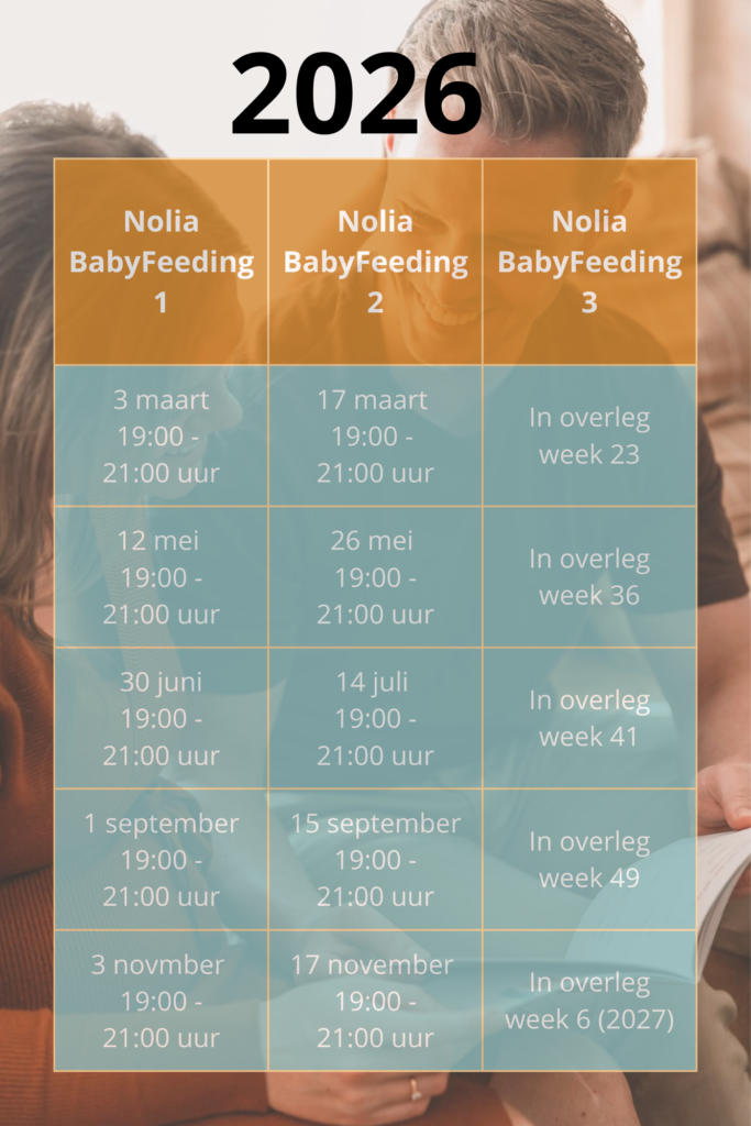 • 3 fysieke workshop van 2 uur, 2 tijdens de zwangerschap en 1 na de bevalling, gegeven door een borstvoedingsexpert